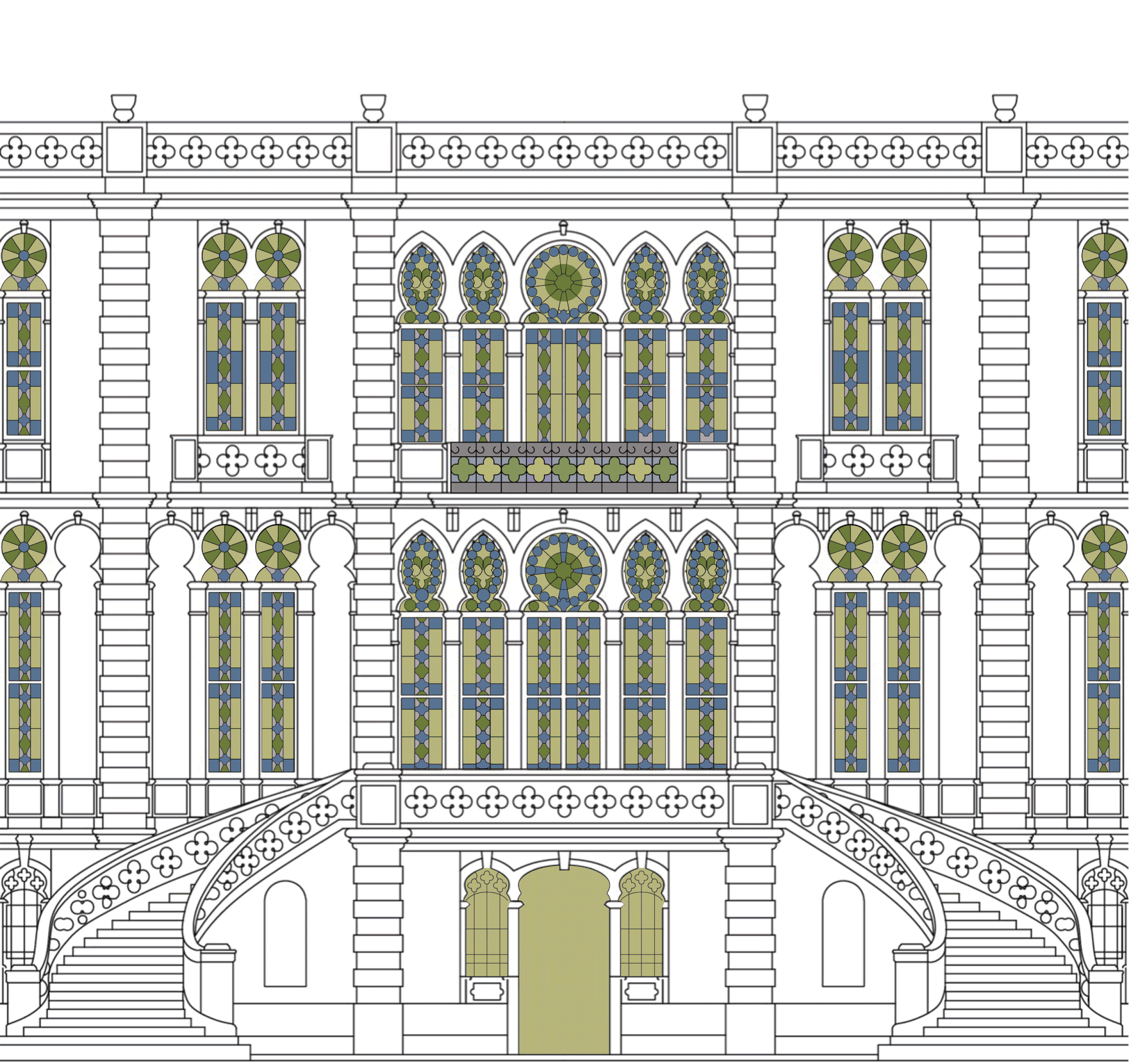 At the center of the identity stands the museum’s façade, the distinguished Beiruti residence built in 1912. Embedded in the institution’s seal, it becomes both anchor and instrument. We developed a series of declinations departing from a precise line drawing: at times restrained and monochrome, at others subtly activated through color, most often by illuminating the stained-glass windows, allowing light to punctuate the structure.
