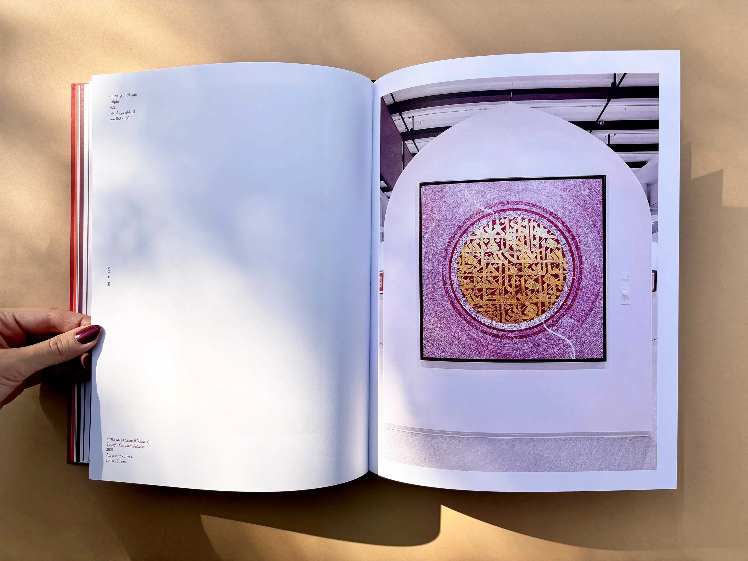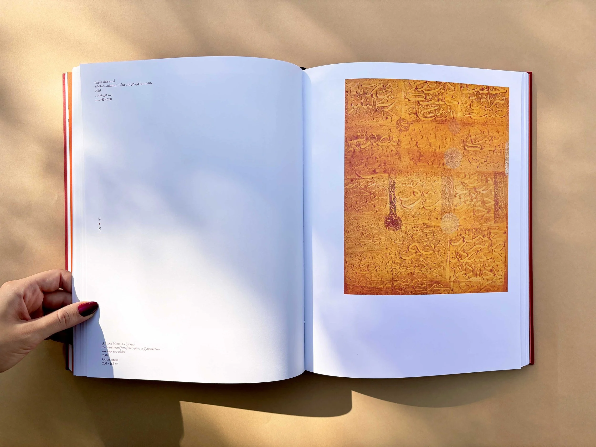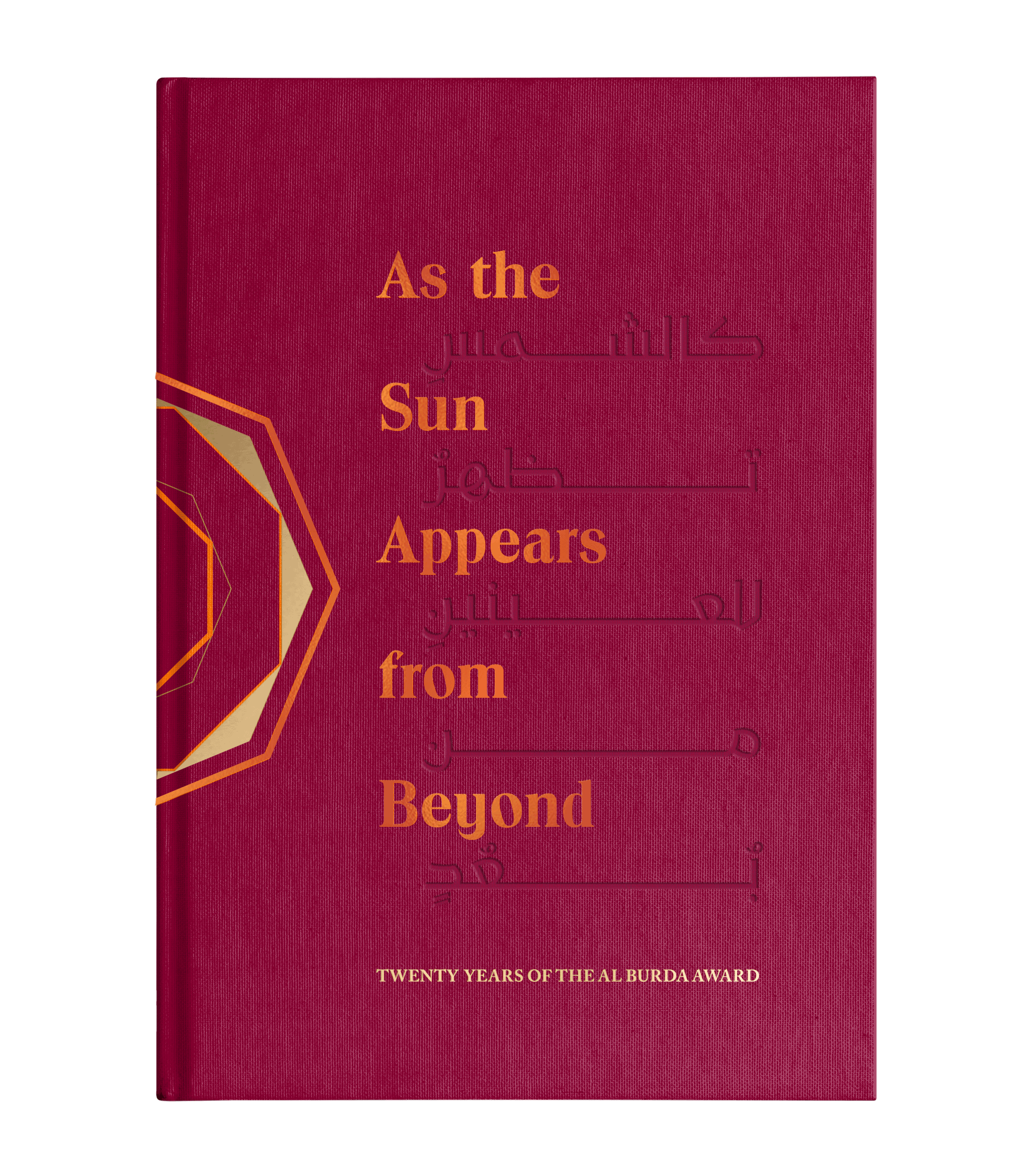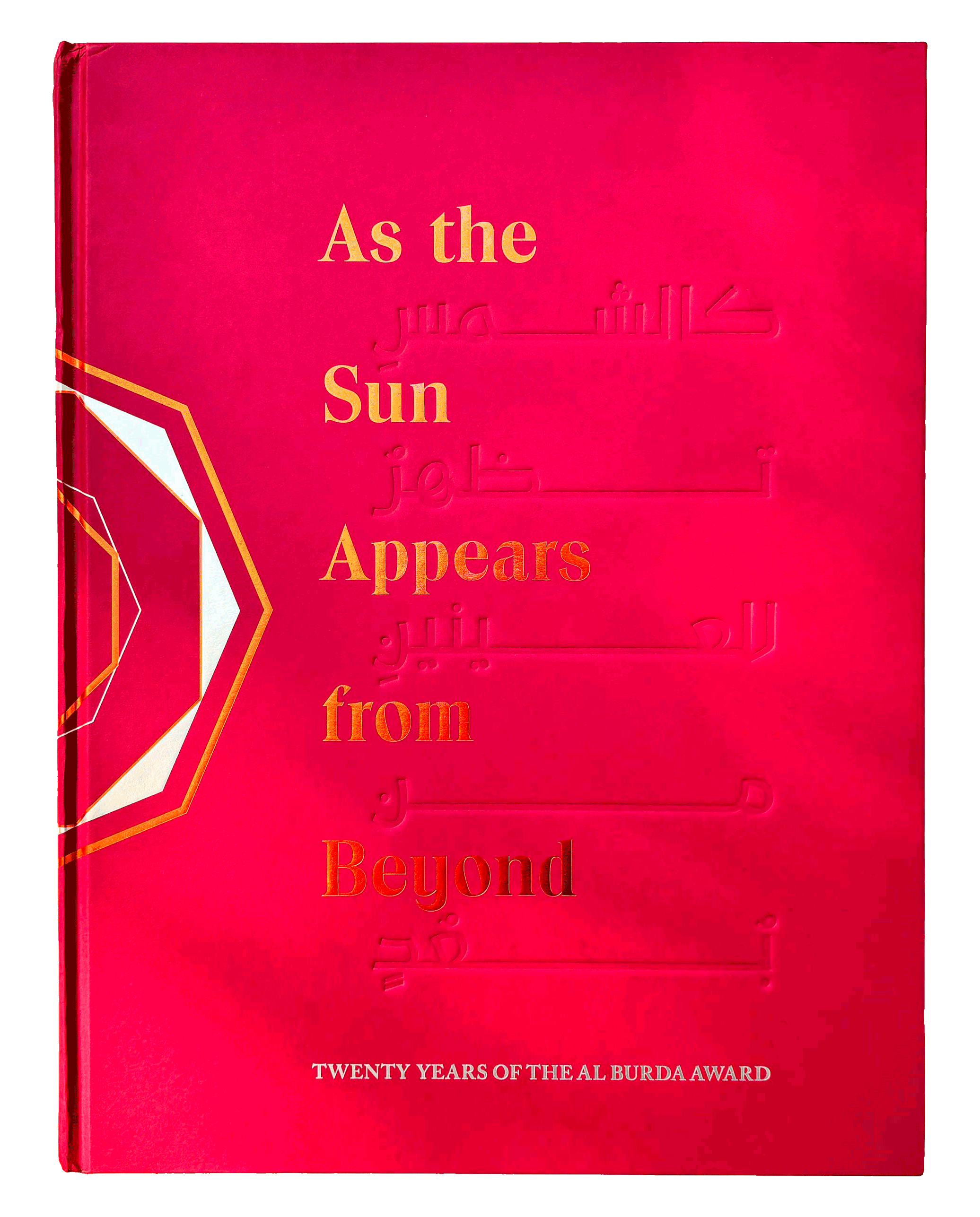 Designed by -scope Ateliers, this bilingual publication, opening from two sides in English and Arabic, offers an elegant and contemplative experience that mirrors the spiritual and aesthetic dualities explored in the exhibition As the Sun Appears from Beyond: Twenty Years of the Al Burda Award. At the center of the book, where both languages meet, lies a curated selection of artworks presented in the exhibition, creating a symbolic and physical convergence of perspectives. The design draws inspiration from the theme of Al Noor (Divine Light), subtly guiding the reader through a visual journey echoing the exhibition’s meditative progression.